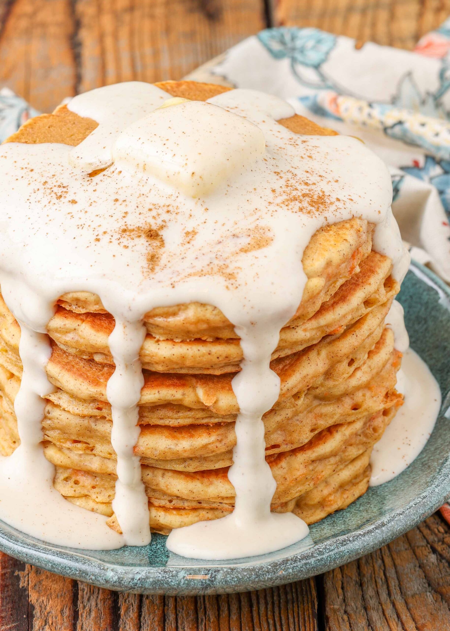- Serve pancakes warm, topped with the cream cheese frosting.